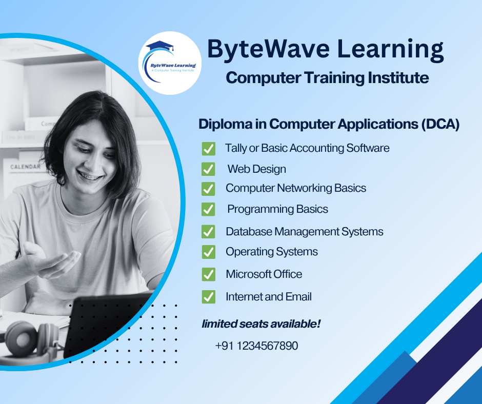 The Diploma in Computer Applications (DCA) is a short-term program designed to provide foundational knowledge of computer systems and applications. It covers essential topics like computer fundamentals, MS Office, internet usage, database management, programming (C/C++ or Python), and web design.